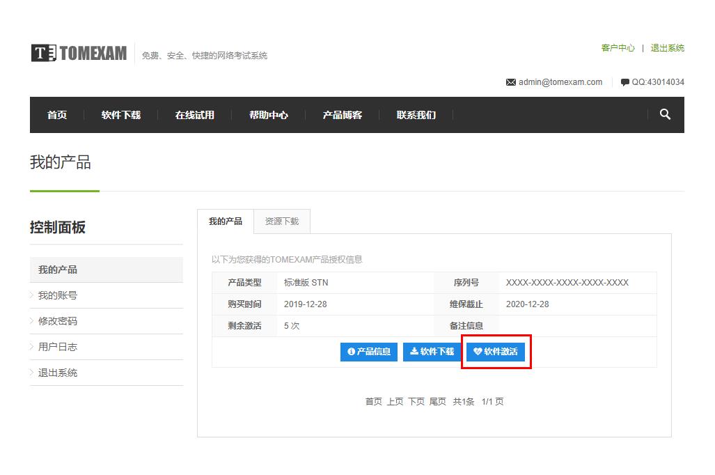 3、在“我的产品”页面,点击“软件激活”按钮,如下图: