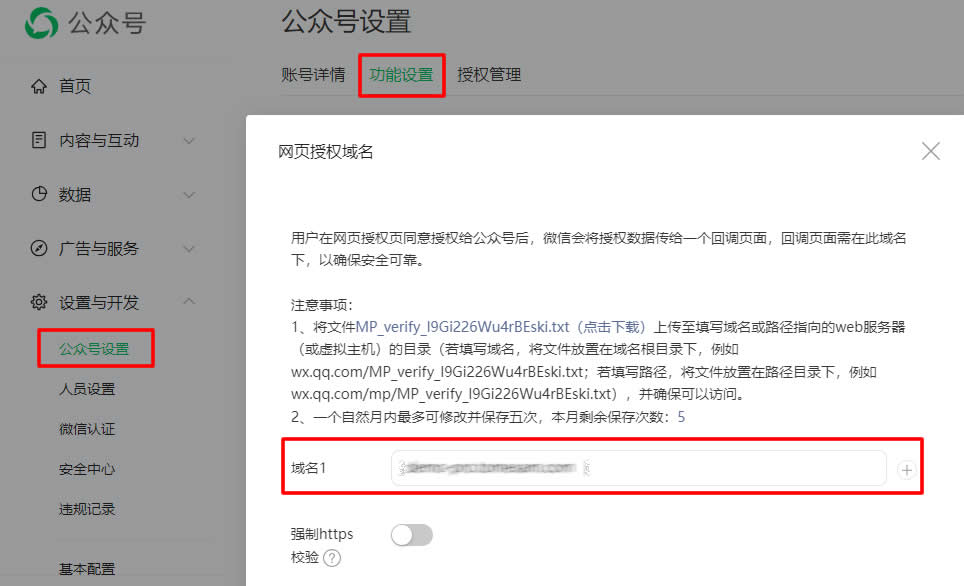 2、设置微信服务号的 “网页授权域名” (路径为:公众号设置-功能设置-网页授权域名),如下图: